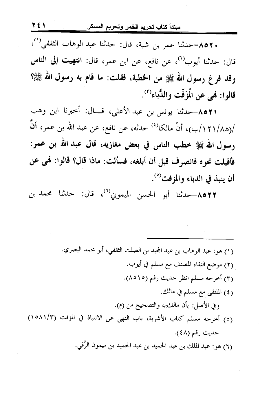 8520 - حدثنا عمر بن شبة، قال: حدثنا عبد الوهاب الثقفي (¬1)، قال: حدثنا أيُّوب (¬2)، عن نافع، عن ابن عمر، قال: انتهت إلى الناس وقد فرغ رسول الله -صلى الله عليه وسلم- من الخطبة، فقلت: ما قام به رسول الله -صلى الله عليه وسلم-؟ قالوا: نهى عن المُزَفّت والدُّباء (¬3).