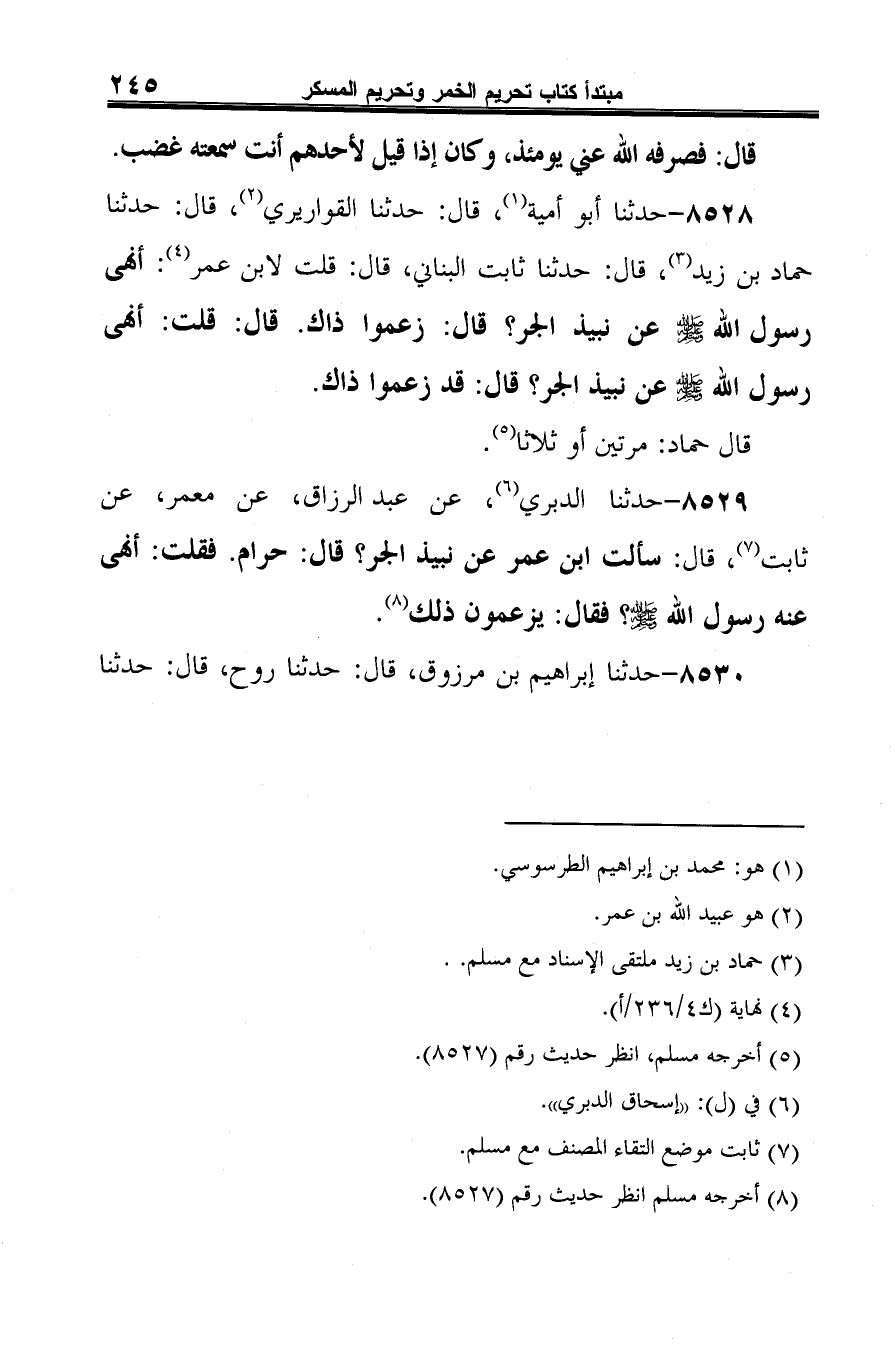 8528 - حدثنا أبو أمية (¬1)، قال: حدثنا القواريري (¬2)، قال: حدثنا حماد بن زيد (¬3)، قال: حدثنا ثابت البناني، قال: قلت لابن عمر (¬4): أنهى رسول الله -صلى الله عليه وسلم- عن نبيذ الجر؟ قال: زعموا ذاك. قال: قلت: أنهى رسول الله -صلى الله عليه وسلم- عن نبيذ الجر؟ قال: قد زعموا ذاك.