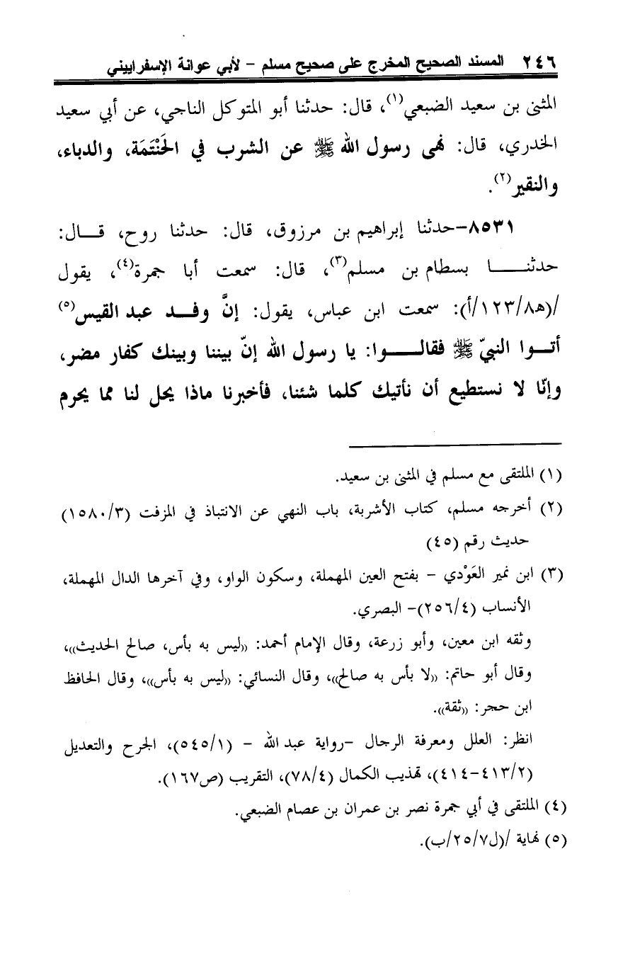 8531 - حدثنا إبراهيم بن مرزوق، قال: حدثنا روحٌ، قال: حدثنا بسطام بن مسلم (¬1)، قال: سمعت أبا جمرة (¬2)، يقول: سمعت ابن عباس، يقول: إنَّ وفد عبد القيس (¬3) أتوا النبيّ -صلى الله عليه وسلم- فقالوا: يا رسول الله إنّ بيننا وبينك كفار مضر، وإنَّا لا نستطيع أن نأتيك كما شئنا، فأخبرنا ماذا يحل لنا مما يحرم