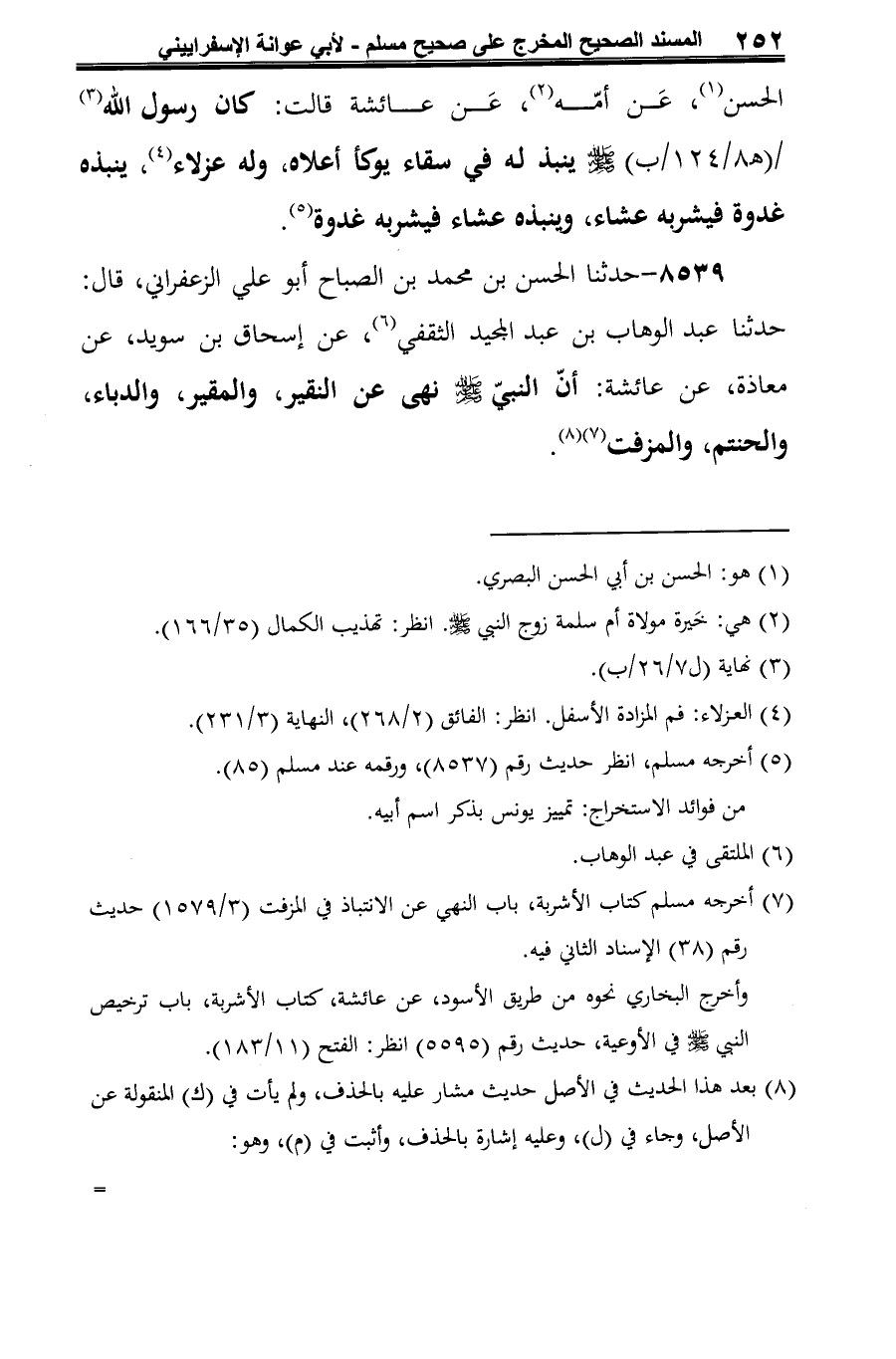 8539 - حدثنا الحسن بن محمد بن الصباح أبو علي الزعفراني، قال: حدثنا عبد الوهاب بن عبد المجيد الثقفي (¬1)، عن إسحاق بن سويد، عن معاذة، عن عائشة: أنّ النبيّ -صلى الله عليه وسلم- نهى عن النقير، والمقير، والدباء، والحنتم، والمزفت (¬2) (¬3).