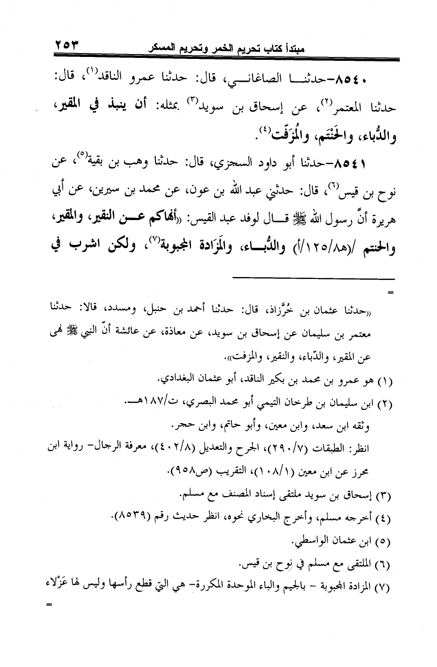 8540 - حدثنا الصاغاني، قال: حدثنا عمرو الناقد (¬1)، قال: حدثنا المعتمر (¬2)، عن إسحاق بن سويد (¬3) بمثله: أن ينبذ في المقير، والدُّباء، والحَنْتَم، والمُزَفّت (¬4).