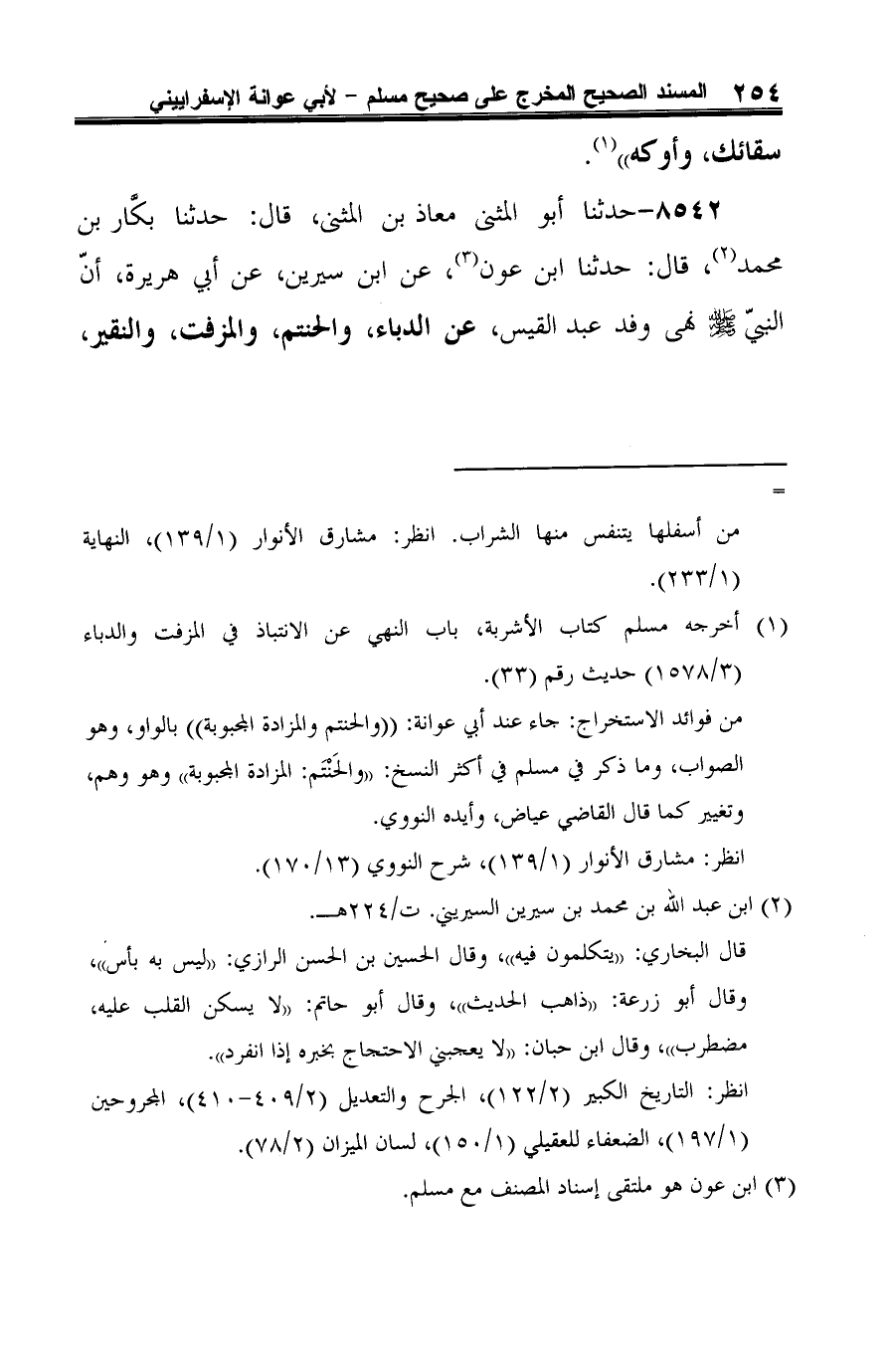8542 - حدثنا أبو المثني معاذ بن المثني، قال: حدثنا بكَّار بن محمد (¬1)، قال: حدثنا ابن عون (¬2)، عن ابن سيرين، عن أبي هريرة، أنّ النبيّ -صلى الله عليه وسلم- نهى وفد عبد القيس، عن الدباء، والحنتم، والمزفت، والنقير،