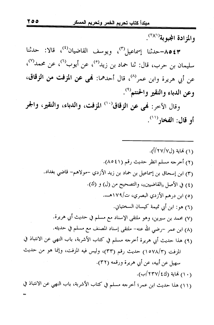 8543 - حدثنا إسماعيل (¬1)، ويوسف القاضيان (¬2)، قالا: حدثنا سليمان بن حرب، قال: ثنا حماد بن زيد (¬3)، عن أيُّوب (¬4)، عن محمد (¬5)، عن أبي هريرة وابن عمر (¬6)، قال أحدهما: نهى عن المزفت من الزقاق، وعن الدباء والنقير والحنتم (¬7).