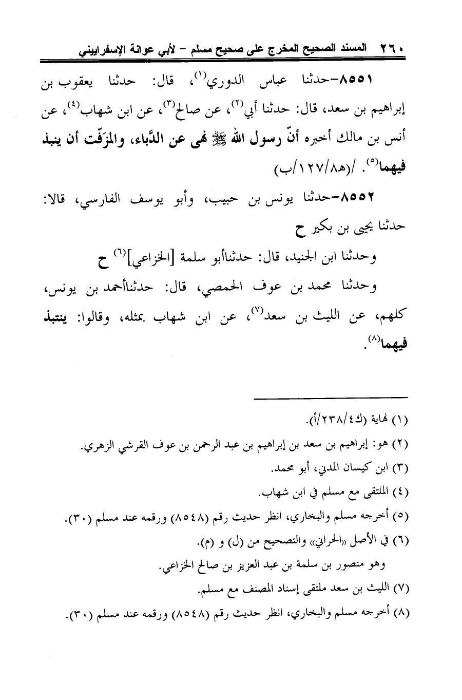 8551 - حدثنا عباس الدوري (¬1)، قال: حدثنا يعقوب بن إبراهيم بن سعد، قال: حدثنا أبي (¬2)، عن صالح (¬3)، عن ابن شهاب (¬4)، عن أنس بن مالك أخبره أنّ رسول الله -صلى الله عليه وسلم- نهى عن الدَّباء، والمزَفّت أن ينبذ فيهما (¬5).
