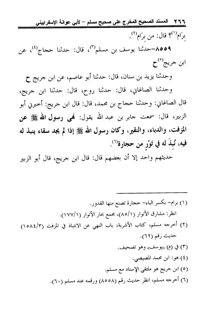 وحدثنا الصاغاني، قال: حدثنا روح، قال: حدثنا ابن جُريج، قال الصاغاني: وحدثنا حجاج بن محمد، قال: قال ابن جُريج: أخبرني أبو الزبير، قال: سمعت جابر بن عبد الله يقول: نهى رسول الله -صلى الله عليه وسلم- عن المزفت، والدباء، والنقير، وكان رسول الله -صلى الله عليه وسلم- إذا لم يجد سقاء ينبذ له فيه، نُبِذَ له في تَوْرٍ من حجارة (¬4).