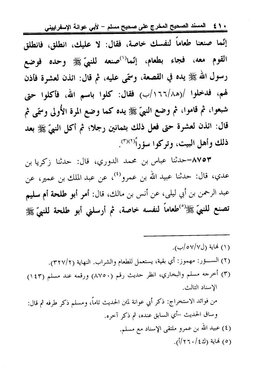 8753 - حدثنا عباس بن محمد الدوري، قال: حدثنا زكريا بن عدي، قال: حدثنا عبيد الله بن عمرو (¬1)، عن عبد الملك بن عمير، عن عبد الرحمن بن أبي ليلى، عن أنس بن مالك، قال: أمر أبو طلحة أم سليم تصنع للنبيّ -صلى الله عليه وسلم- (¬2) طعامًا لنفسه خاصة، ثم أرسلني أبو طلحة للنبيّ -صلى الله عليه وسلم-