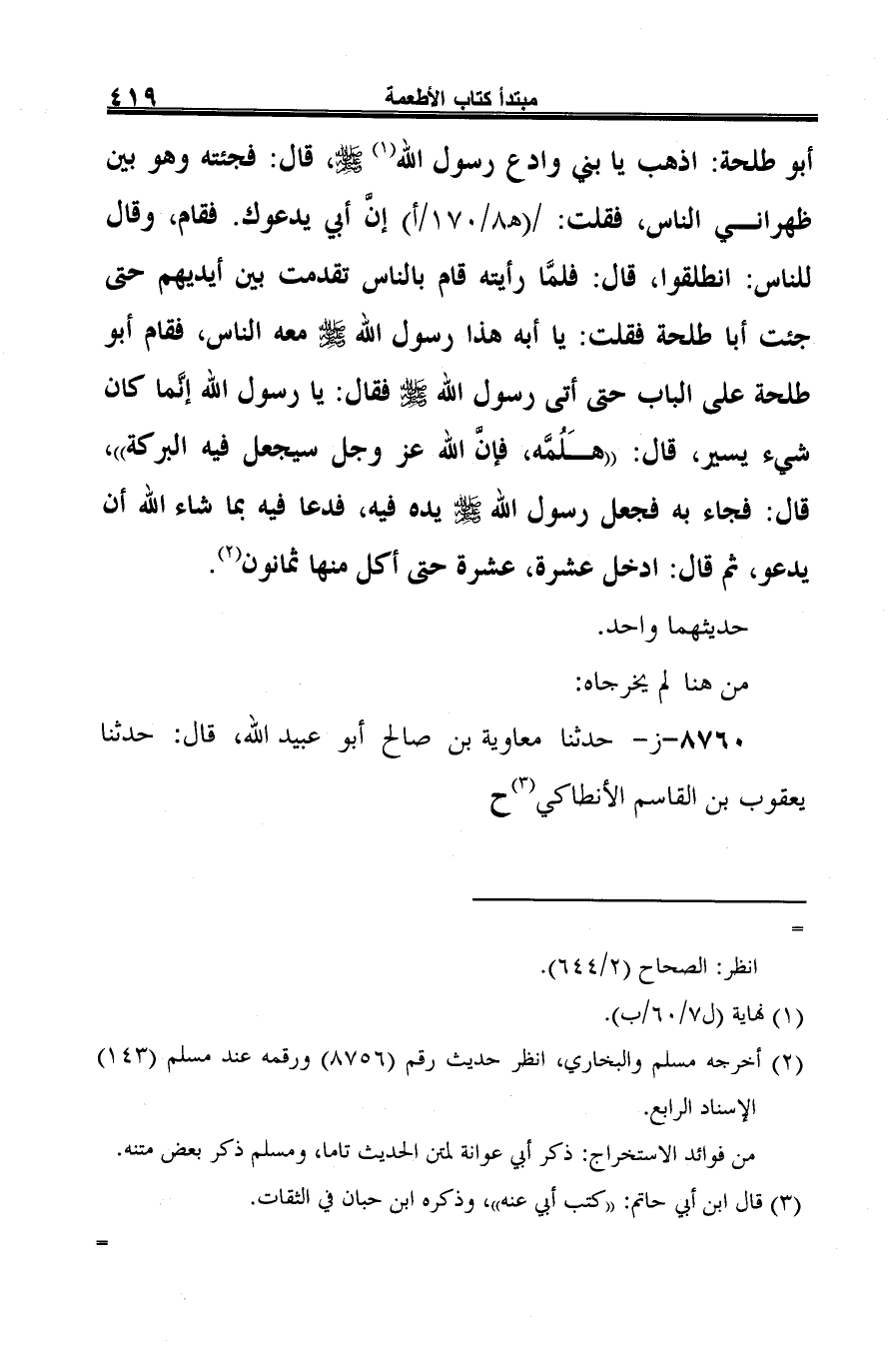 (¬9) هذا الحديث في جميع النسخ المعتمدة من مسند أبي طلحة زيد بن سهل الأنصاري، وقد جعله الحافظ ابن حجر في إتحاف المهرة (2/ 90) من مسند أنس بن مالك، ووقع في المطبوع من الإتحاف تحريفان: يعقوب بن القاسم الأنطاكي، جاء يعقوب الفارسي، وحاتم بن إسماعيل جاء خالد بن إسماعيل.