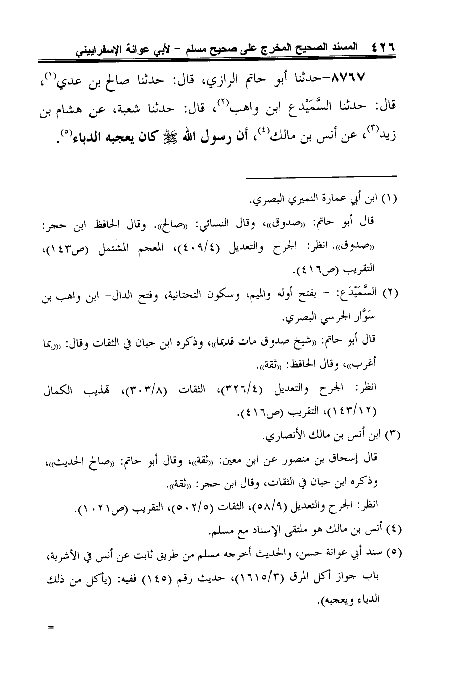 (¬5) سند أبي عوانة حسن، والحديث أخرجه مسلم من طريق ثابت عن أنس في الأشربة، باب جواز أكل المرق (3/ 1615)، حديث رقم (145) ففيه: (يأكل من ذلك الدباء ويعجبه). =