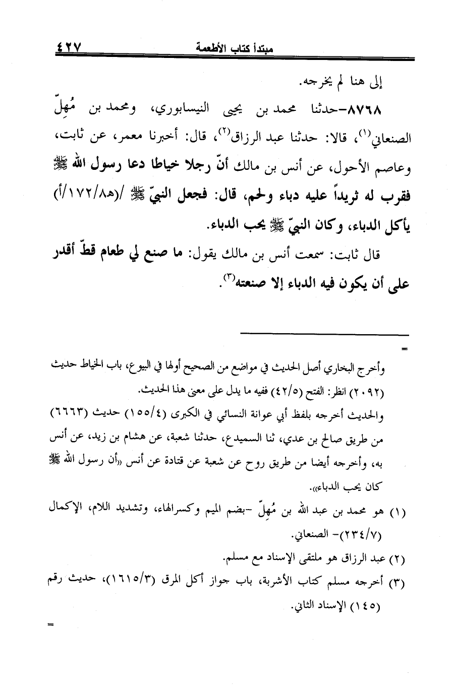 8768 - حدثنا محمد بن يحيى النيسابوري، ومحمد بن مُهِلّ الصنعاني (¬1)، قالا: حدثنا عبد الرزاق (¬2)، قال: أخبرنا معمر، عن ثابت، وعاصم الأحول، عن أنس بن مالك أنّ رجلا خياطا دعا رسول الله -صلى الله عليه وسلم- فقرب له ثريدًا عليه دباء ولحم، قال: فجعل النبيّ -صلى الله عليه وسلم- يأكل الدباء، وكان النبيّ -صلى الله عليه وسلم- يحب الدباء.