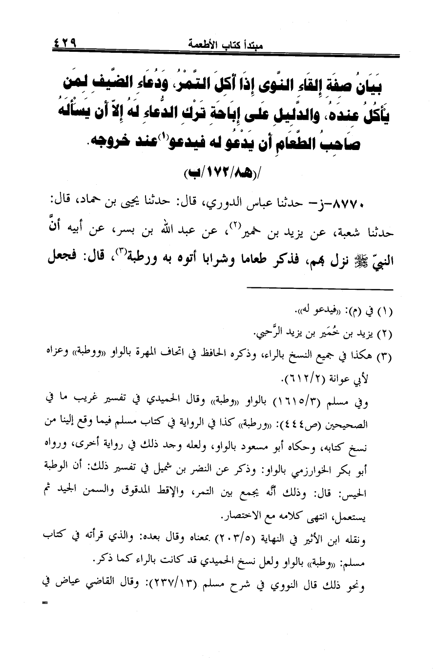 (¬2) هكذا في جميع النسخ بالراء، وذكره الحافظ في إتحاف المهرة بالواو "ووطبة" وعزاه لأبي عوانة (2/ 612).