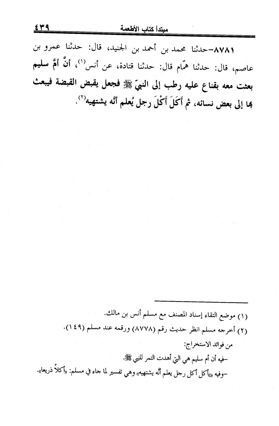 8781 - حدثنا محمد بن أحمد بن الجنيد، قال: حدثنا عمرو بن عاصم، قال: حدثنا همّام قال: حدثنا قتادة، عن أنس (¬1)، أنَّ أمَّ سليم بعثت معه بقناع عليه رطب إلى النبيّ -صلى الله عليه وسلم- فجعل يقبض القبضة فيبعث بها إلى بعض نسائه، ثم أَكَلَ أَكْلَ رجل يُعلم أنَّه يشتهيه (¬2).