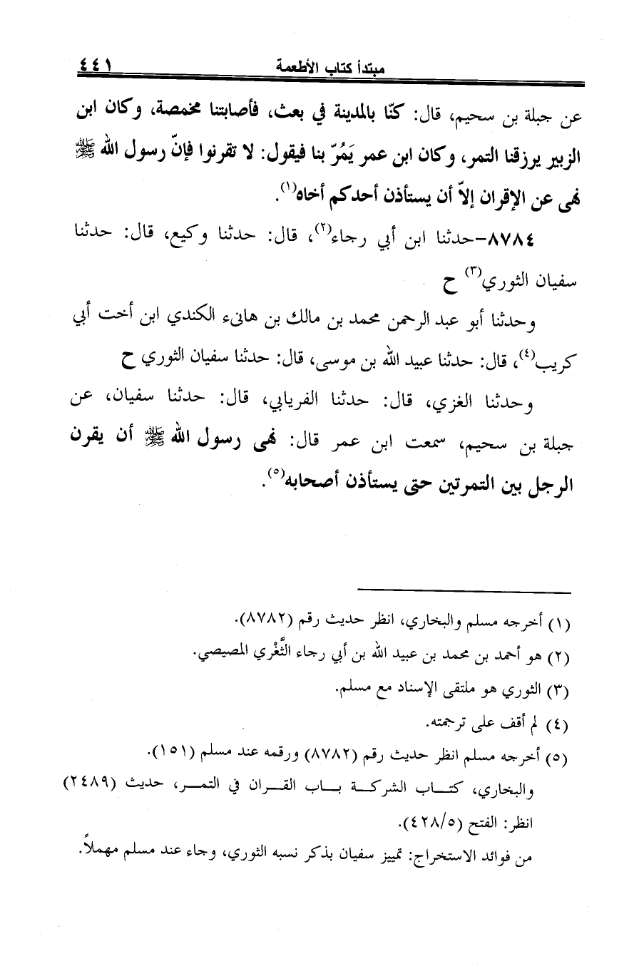 وحدثنا الغزي، قال: حدثنا الفريابي، قال: حدثنا سفيان، عن جبلة بن سحيم، سمعت ابن عمر قال: نهى رسول الله -صلى الله عليه وسلم- أن يقرن الرجل بين التمرتين حتى يستأذن أصحابه (¬4).