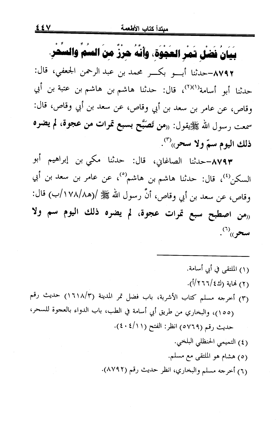 (¬3) أخرجه مسلم كتاب الأشربة، باب فضل تمر المدينة (3/ 1618) حديث رقم (155)، والبخاري من طريق أبي أسامة في الطب، باب الدواء بالعجوة للسحر، حديث رقم (5769) انظر: الفتح (11/ 401).
