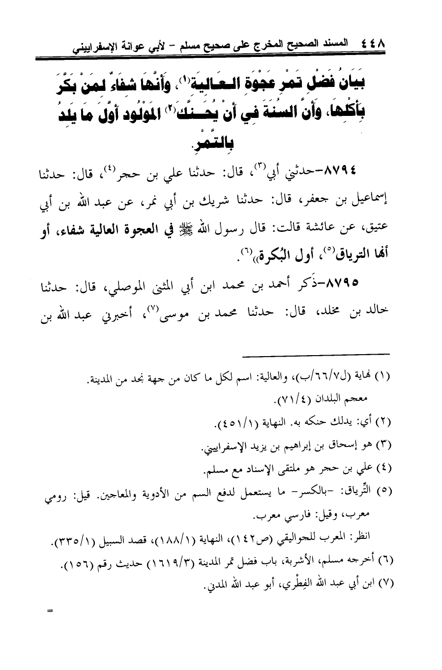 8794 - حدثني أبي (¬1)، قال: حدثنا علي بن حجر (¬2)، قال: حدثنا إسماعيل بن جعفر، قال: حدثنا شريك بن أبي نمر، عن عبد الله بن أبي عتيق، عن عائشة قالت: قال رسول الله -صلى الله عليه وسلم- في العجوة العالية شفاء، أو أنها الترياق (¬3)، أول البُكرة" (¬4).