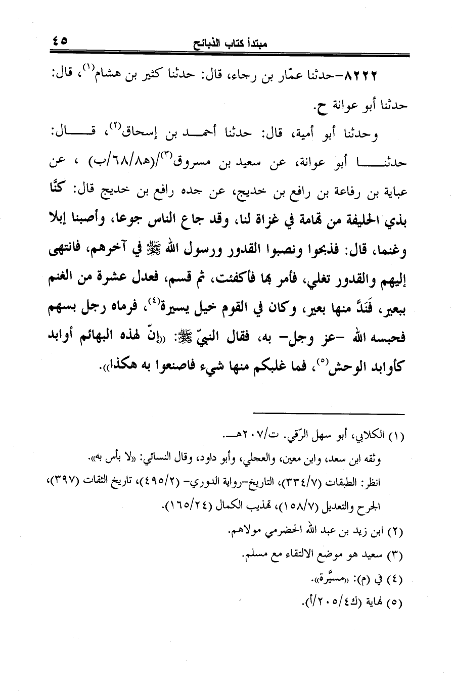 وحدثنا أبو أمية، قال: حدثنا أحمد بن إسحاق (¬2)، قال: حدثنا أبو عوانة، عن سعيد بن مسروق (¬3)، عن عباية بن رفاعة بن رافع بن خديج، عن جده رافع بن خديج قال: كنَّا بذي الحليفة من تهامة في غزاة لنا، وقد جاع الناس جوعا، وأصبنا إبلا وغنما، قال: فذبحوا ونصبوا القدور ورسول الله -صلى الله عليه وسلم- في آخرهم، فانتهى إليهم والقدور تغلي، فأمر بها فأكفئت، ثم قسم، فعدل عشرة من الغنم ببعير، فَنَدَّ منها بعير، وكان في القوم خيل يسيرة (¬4)، فرماه رجل بسهم فحبسه الله -عز وجل- به، فقال النبيّ -صلى الله عليه وسلم-: "إنّ هذه البهائم أوابد كأوابد الوحش (¬5)، فما غلبكم منها شيء فاصنعوا به هكذا".