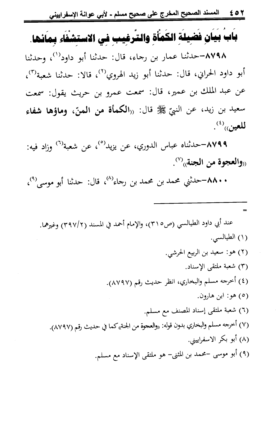8798 - حدثنا عمار بن رجاء، قال: حدثنا أبو داود (¬1)، وحدثنا أبو داود الحراني، قال: حدثنا أبو زيد الهروي (¬2)، قالا: حدثنا شعبة (¬3)، عن عبد الملك بن عمير، قال: سمعت عمرو بن حريث يقول: سمعت سعيد بن زيد، عن النبيّ -صلى الله عليه وسلم- قال: "الكمأة من المنّ، وماؤها شفاء للعين" (¬4).