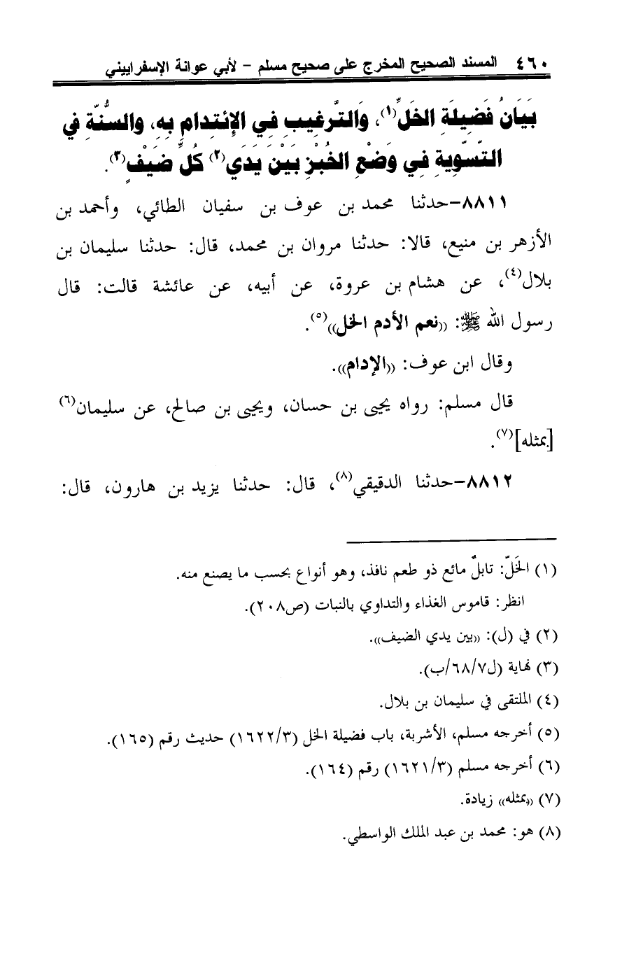8811 - حدثنا محمد بن عوف بن سفيان الطائي، وأحمد بن الأزهر بن منيع، قالا: حدثنا مروان بن محمد، قال: حدثنا سليمان بن بلال (¬1)، عن هشام بن عروة، عن أبيه، عن عائشة قالت: قال رسول الله -صلى الله عليه وسلم-: "نعم الإدام الخل" (¬2).