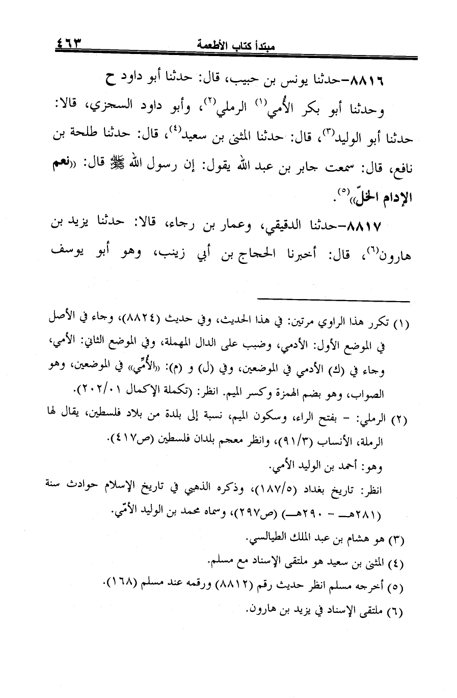 وحدثنا أبو بكر الأُمي (¬1) الرملي (¬2)، وأبو داود السجزي، قالا: حدثنا أبو الوليد (¬3)، قال: حدثنا المثنى بن سعيد (¬4)، قال: حدثنا طلحة بن نافع، قال: سمعت جابر بن عبد الله يقول: إن رسول الله -صلى الله عليه وسلم- قال: "نعم الإدام الخلّ" (¬5).
