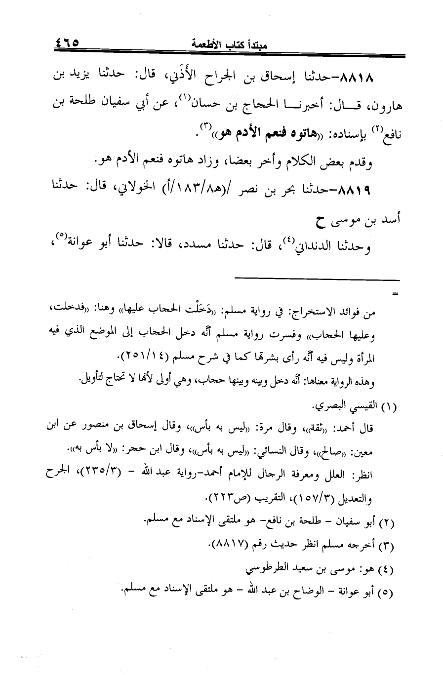 8818 - حدثنا إسحاق بن الجراح الأَذَني، قال: حدثنا يزيد بن هارون، قال: أخبرنا الحجاج بن حسان (¬1)، عن أبي سفيان طلحة بن نافع (¬2) بإسناده: "هاتوه فنعم الأدم هو" (¬3).