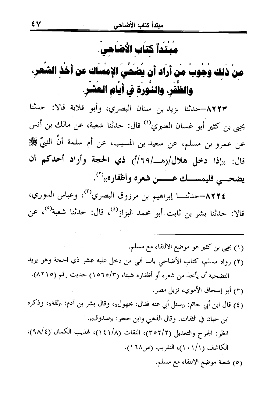 8223 - حدثنا يزيد بن سنان البصري، وأبو قلابة قالا: حدثنا يحيى بن كثير أبو غسان العنبري (¬1) قال: حدثنا شعبة، عن مالك بن أنس عن عمرو بن مسلم، عن سعيد بن المسيب، عن أم سلمة أنَّ النبيّ -صلى الله عليه وسلم- قال: "إذا دخل هلال ذي الحجة وأراد أحدكم أن يضحي فليمسك عن شعره وأظفاره" (¬2).