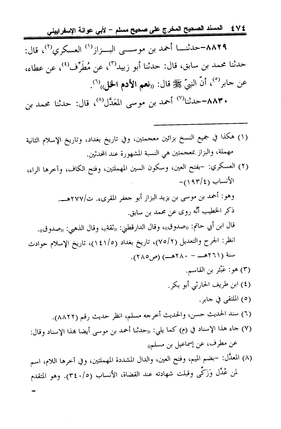8829 - حدثنا أحمد بن موسى البزاز (¬1) العسكري (¬2)، قال: حدثنا محمد بن سابق، قال: حدثنا أبو زبيد (¬3)، عن مُطرِّف (¬4)، عن عطاء، عن جابر (¬5)، أنّ النبيّ -صلى الله عليه وسلم- قال: "نعم الأدم الخل" (¬6).