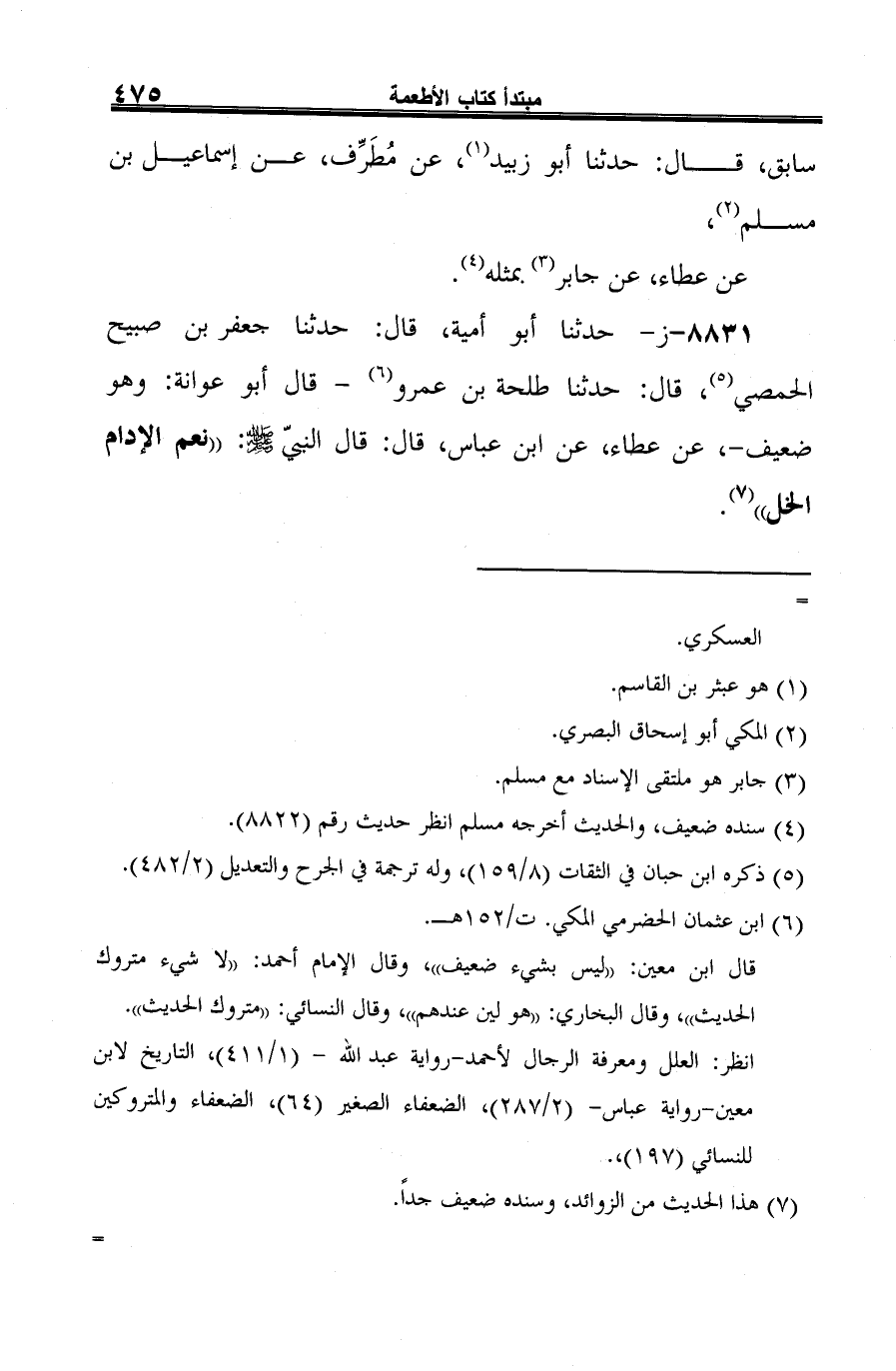 8831 - ز- حدثنا أبو أمية، قال: حدثنا جعفر بن صبيح الحمصي (¬1)، قال: حدثنا طلحة بن عمرو (¬2) -قال أبو عوانة: وهو ضعيف-، عن عطاء، عن ابن عباس، قال: قال النبيّ -صلى الله عليه وسلم-: "نعم الإدام الخل" (¬3).
