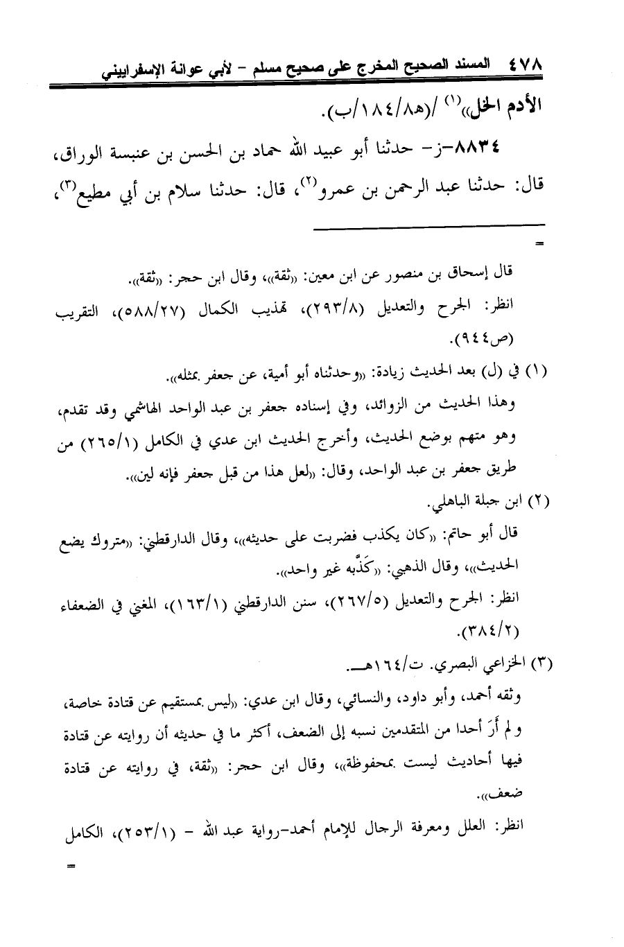 8834 - ز- حدثنا أبو عبيد الله حماد بن الحسن بن عنبسة الوراق، قال: حدثنا عبد الرحمن بن عمرو (¬1)، قال: حدثنا سلام بن أبي مطيع (¬2)،