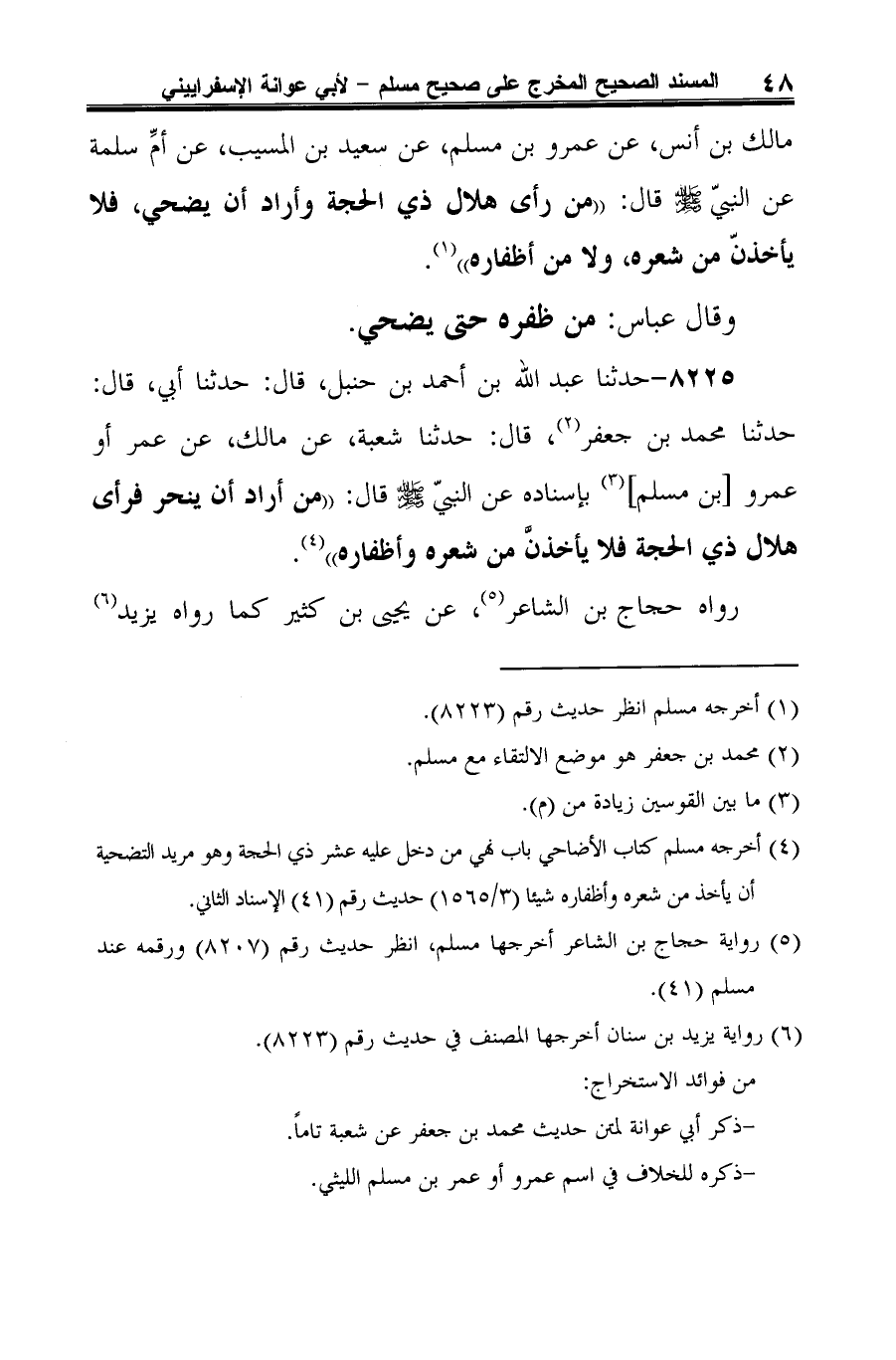 8225 - حدثنا عبد الله بن أحمد بن حنبل، قال: حدثنا أبي، قال: حدثنا محمد بن جعفر (¬1)، قال: حدثنا شعبة، عن مالك، عن عمر أو عمرو [بن مسلم] (¬2) بإسناده عن النبيّ -صلى الله عليه وسلم- قال: "من أراد أن ينحر فرأى هلال ذي الحجة فلا يأخذنَّ من شعره وأظفاره" (¬3).