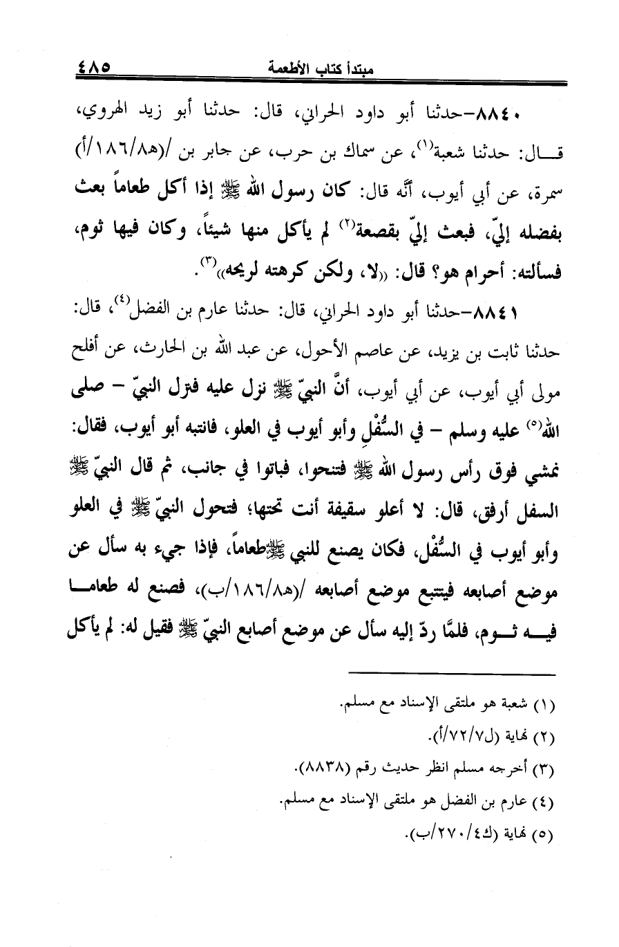 8841 - حدثنا أبو داود الحراني، قال: حدثنا عارم بن الفضل (¬1)، قال: حدثنا ثابت بن يزيد، عن عاصم الأحول، عن عبد الله بن الحارث، عن أفلح مولى أبي أيوب، عن أبي أيوب، أن النبيّ -صلى الله عليه وسلم- نزل عليه فنزل النبيّ -صلى الله (¬2) عليه وسلم- في السُّفْلِ وأبو أيوب في العلو، فانتبه أبو أيوب، فقال: نمشي فوق رأس رسول الله -صلى الله عليه وسلم- فتنحوا، فباتوا في جانب، ثم قال النبي -صلى الله عليه وسلم- السفل أرفق، قال: لا أعلو سقيفة أنت تحتها؛ فتحول النبيّ -صلى الله عليه وسلم- في العلو وأبو أيوب في السُّفْل، فكان يصنع للنبيّ -صلى الله عليه وسلم- طعامًا، فإذا جيء به سأل عن موضع أصابعه فيتتبع موضع أصابعه، فصنع له طعاما فيه ثوم، فلمَّا ردّ إليه سأل عن موضع أصابع النبيّ -صلى الله عليه وسلم- فقيل له: لم يأكل