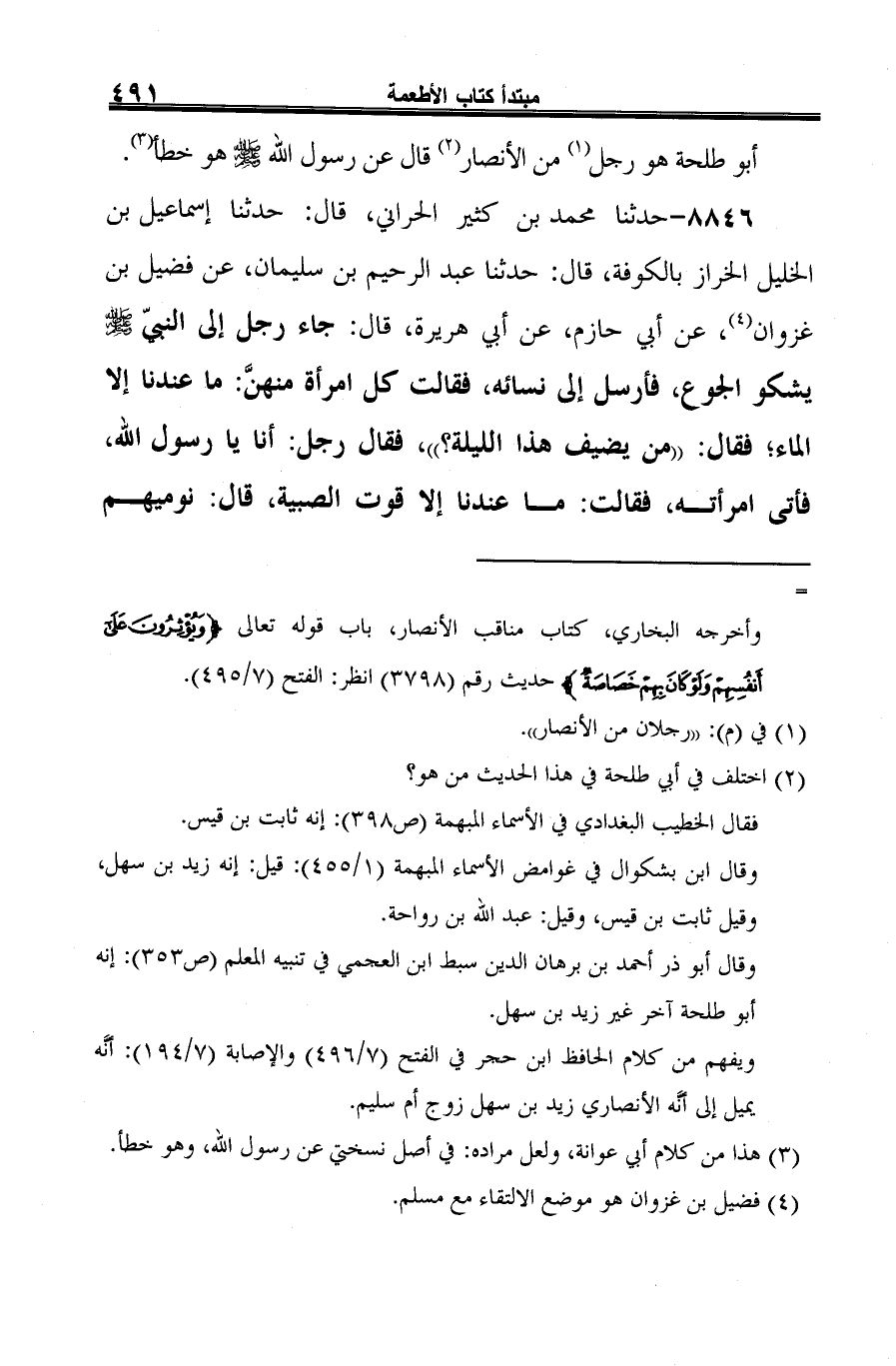 8846 - حدثنا محمد بن كثير الحراني، قال: حدثنا إسماعيل بن الخليل الخراز بالكوفة، قال: حدثنا عبد الرحيم بن سليمان، عن فضيل بن غزوان (¬1)، عن أبي حازم، عن أبي هريرة، قال: جاء رجل إلى النبيّ -صلى الله عليه وسلم- يشكو الجوع، فأرسل إلى نسائه، فقالت كل امرأة منهنَّ: ما عندنا إلا الماء؛ فقال: "من يضيف هذا الليلة؟ "، فقال رجل: أنا يا رسول الله، فأتى امرأته، فقالت: ما عندنا إلا قوت الصبية، قال: نوميهم