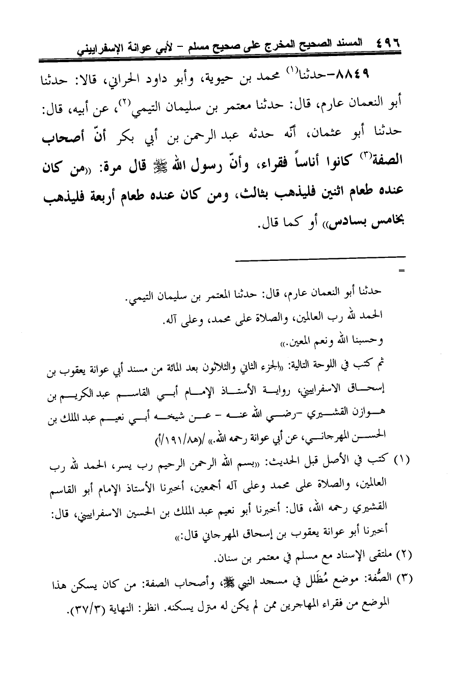 8849 - حدثنا (¬1) محمد بن حيوية، وأبو داود الحراني، قالا: حدثنا أبو النعمان عارم، قال: حدثنا معتمر بن سليمان التيمي (¬2)، عن أبيه، قال: حدثنا أبو عثمان، أنّه حدثه عبد الرحمن بن أبي بكر أنّ أصحاب الصفة (¬3) كانوا أناسًا فقراء، وأنّ رسول الله -صلى الله عليه وسلم- قال مرة: "من كان عنده طعام اثنين فليذهب بثالث، ومن كان عنده طعام أربعة فليذهب بخامس بسادس" أو كما قال.
