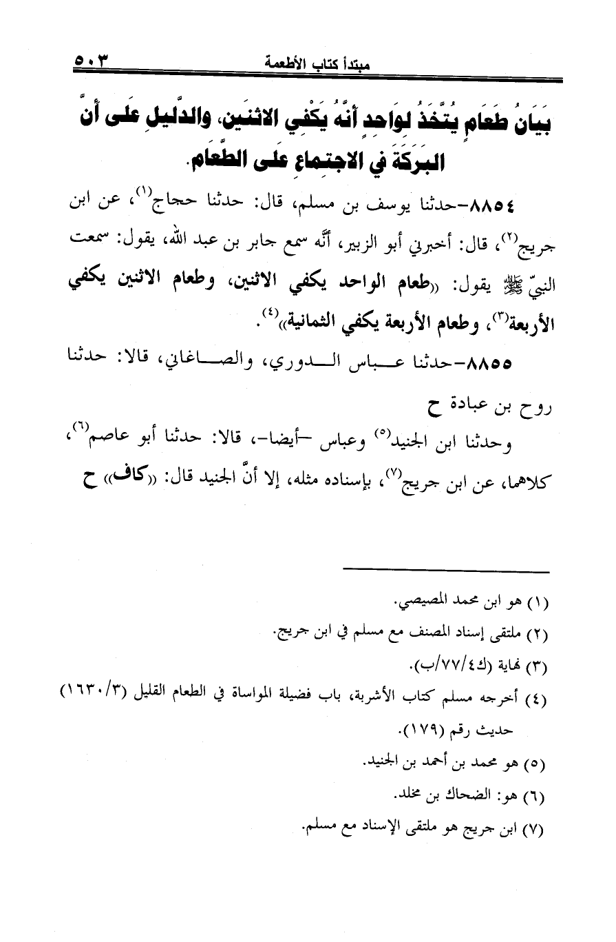 8854 - حدثنا يوسف بن مسلم، قال: حدثنا حجاج (¬1)، عن ابن جريج (¬2)، قال: أخبرني أبو الزبير، أنَّه سمع جابر بن عبد الله، يقول: سمعت النبيّ -صلى الله عليه وسلم- يقول: "طعام الواحد يكفي الاثنين، وطعام الاثنين يكفي الأربعة (¬3)، وطعام الأربعة يكفي الثمانية" (¬4).