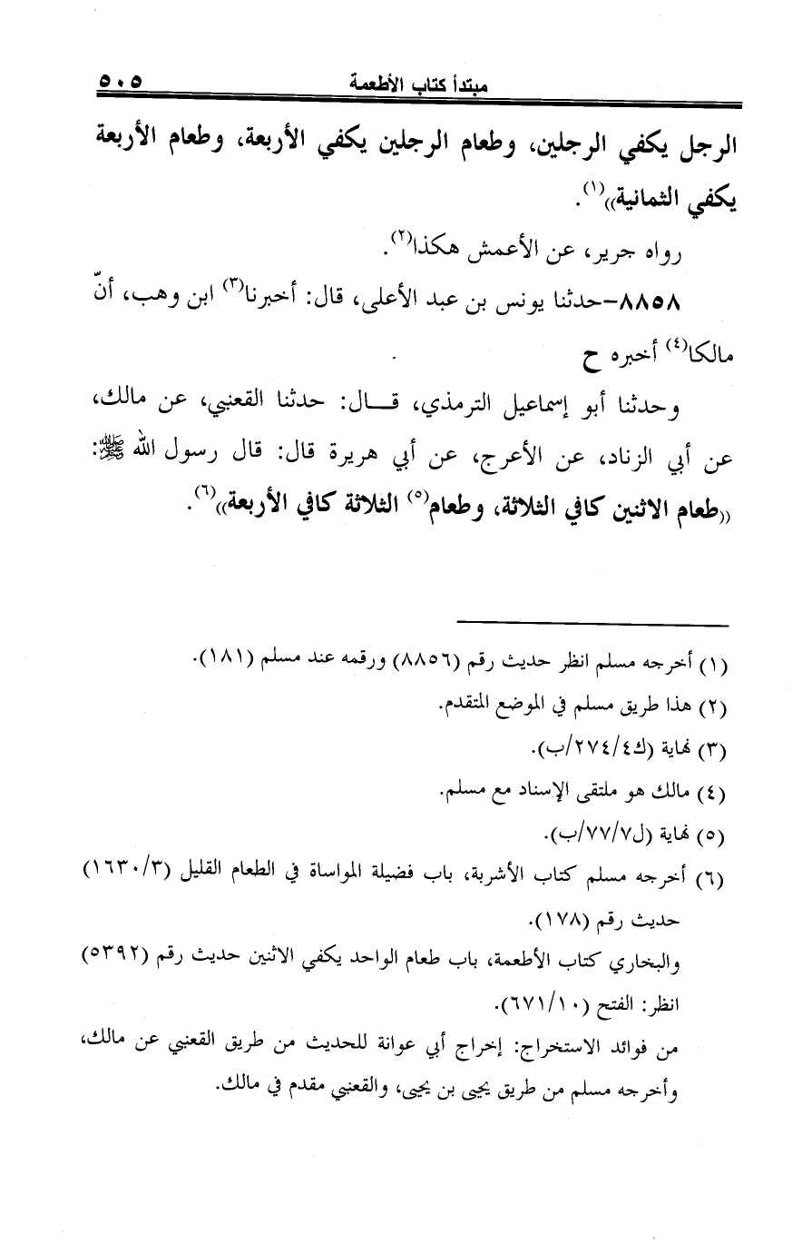 وحدثنا أبو إسماعيل الترمذي، قال: حدثنا القعنبي، عن مالك، عن أبي الزناد، عن الأعرج، عن أبي هريرة قال: قال رسول الله -صلى الله عليه وسلم-: "طعام الاثنين كافي الثلاثة، وطعام (¬3) الثلاثة كافي الأربعة" (¬4).