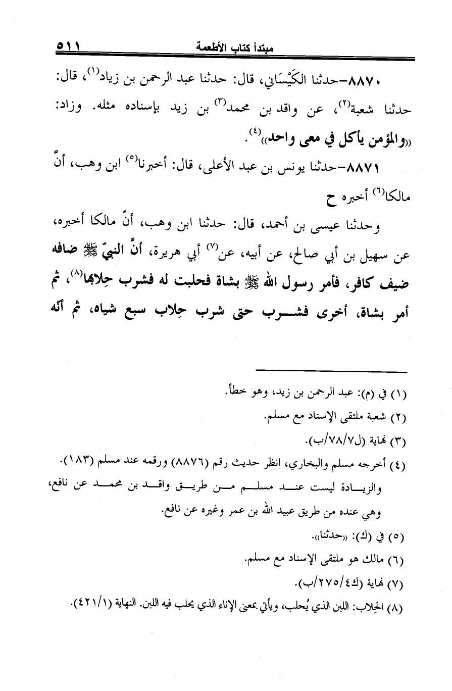 8871 - حدثنا يونس بن عبد الأعلى، قال: أخبرنا (¬1) ابن وهب، أنَّ مالكا (¬2) أخبره ح وحدثنا عيسى بن أحمد، قال: حدثنا ابن وهب، أنّ مالكا أخبره، عن سهيل بن أبي صالح، عن أبيه، عن (¬3) أبي هريرة، أن النبيّ -صلى الله عليه وسلم- ضافه ضيف كافر، فأمر رسول الله -صلى الله عليه وسلم- بشاة فحلبت له فشرب حِلابها (¬4)، ثم أمر بشاة، أخرى فشرب حتى شرب حِلاب سبع شياه، ثم أنّه