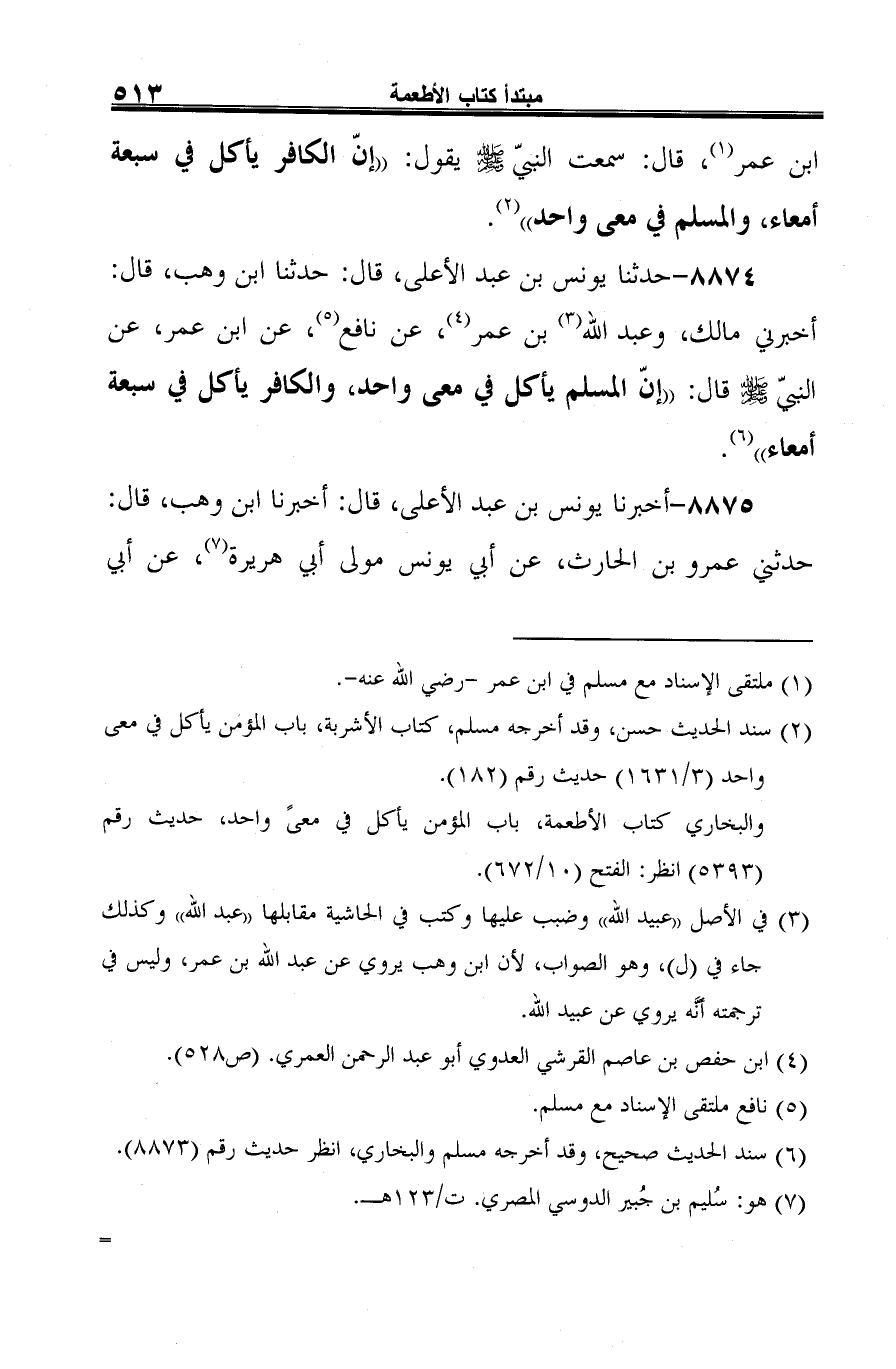8874 - حدثنا يونس بن عبد الأعلى، قال: حدثنا ابن وهب، قال: أخبرني مالك، وعبد الله (¬1) بن عمر (¬2)، عن نافع (¬3)، عن ابن عمر، عن النبيّ -صلى الله عليه وسلم- قال: "إنّ المسلم يأكل في معى واحد، والكافر يأكل في سبعة أمعاء" (¬4).