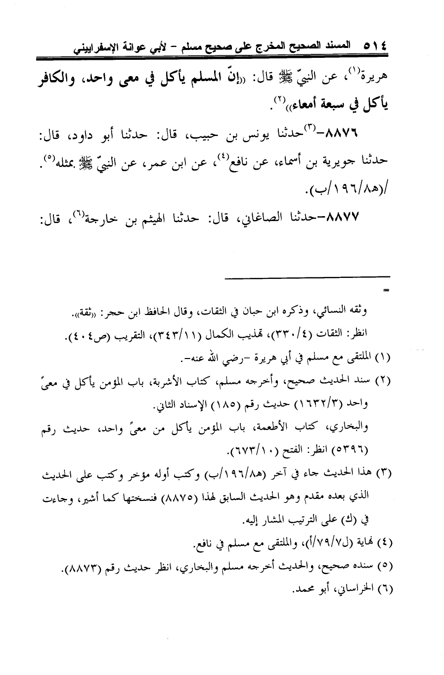 -[515]- حدثنا حفص بن ميسرة (¬2) عن العلاء بن عبد الرحمن (¬3)، عن أبيه، عن أبي هريرة، عن النبيّ -صلى الله عليه وسلم- قال: "الكافر يأكل في سبعة أمعاء، والمؤمن (¬4) يأكل في معى واحد" (¬5).