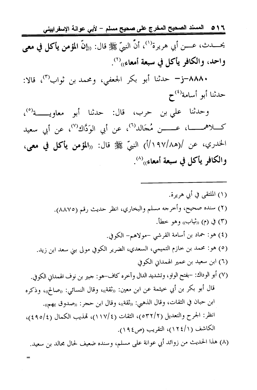 وحدثنا علي بن حرب، قال: حدثنا أبو معاوية (¬3)، كلاهما، عن مُجَالد (¬4)، عن أبي الوَدَّاك (¬5)، عن أبي سعيد الخدري، عن النبيّ -صلى الله عليه وسلم- قال: "المؤمن يأكل في معى، والكافر يأكل في سبعة أمعاء" (¬6).