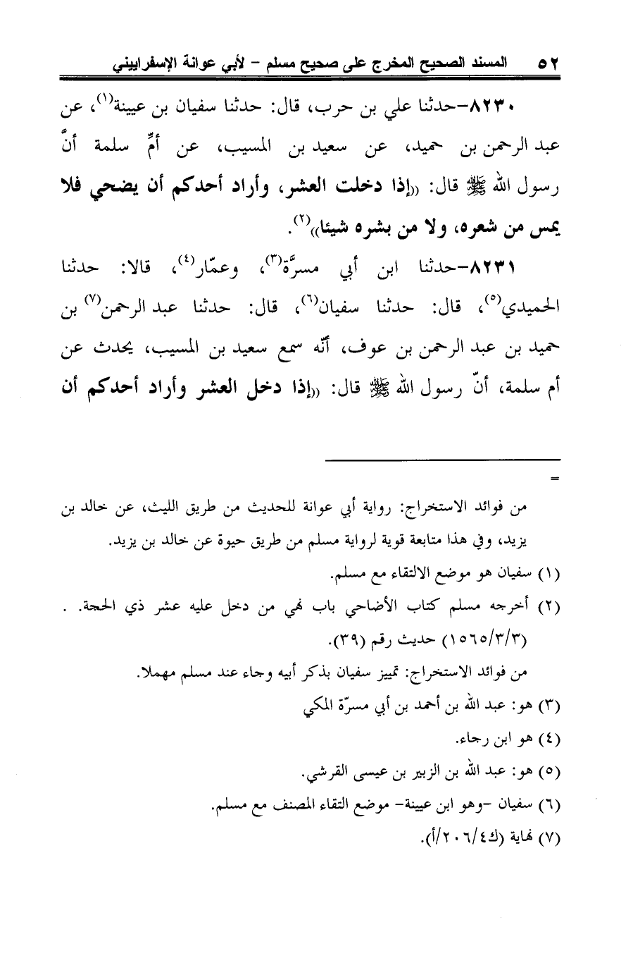 8230 - حدثنا علي بن حرب، قال: حدثنا سفيان بن عيينة (¬1)، عن عبد الرحمن بن حميد، عن سعيد بن المسيب، عن أمِّ سلمة أنَّ رسول الله -صلى الله عليه وسلم- قال: "إذا دخلت العشر، وأراد أحدكم أن يضحي فلا يمس من شعره، ولا من بشره شيئا" (¬2).