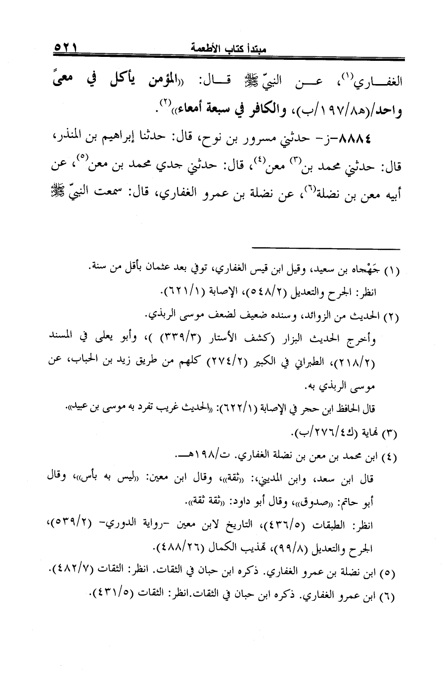 -[522]- يقول: "إنَّ المؤمن يشرب في معى واحد، والكافر يشرب في سبعة أمعاء" (¬5).
