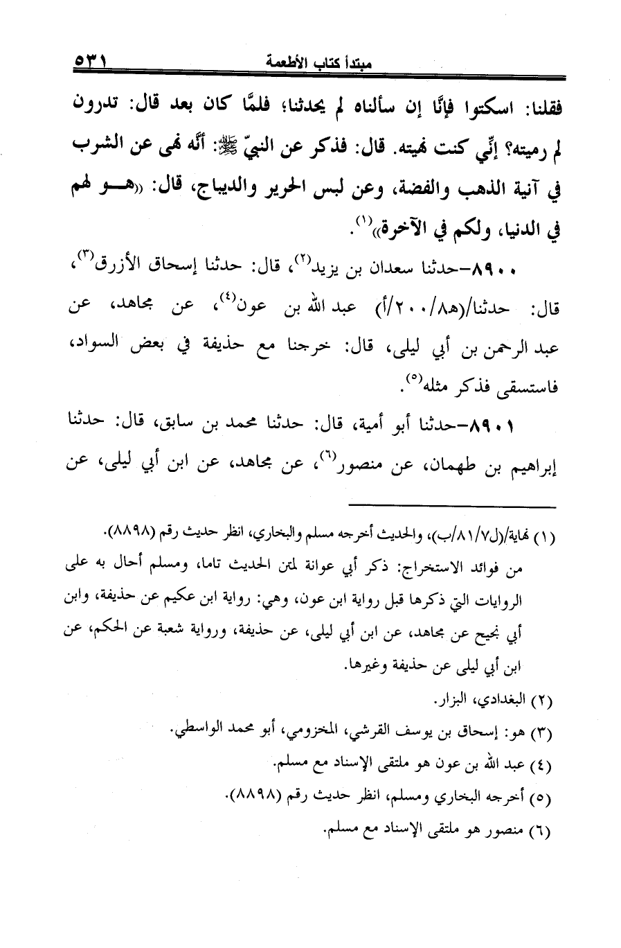 8900 - حدثنا سعدان بن يزيد (¬1)، قال: حدثنا إسحاق الأزرق (¬2)، قال: حدثنا عبد الله بن عون (¬3)، عن مجاهد، عن عبد الرحمن بن أبي ليلى، قال: خرجنا مع حذيفة في بعض السواد، فاستسقى فذكر مثله (¬4).
