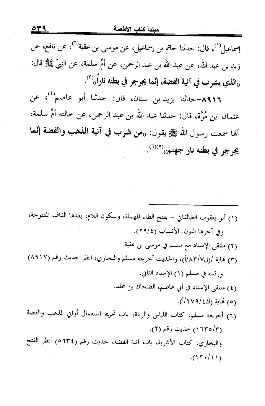 8916 - حدثنا يزيد بن سنان، قال: حدثنا أبو عاصم (¬1)، عن عثمان ابن مُرَّة، قال: حدثنا عبد الله بن عبد الرحمن، عن خالته أمِّ سلمة، أنها سمعت رسول الله -صلى الله عليه وسلم- يقول: "من شرب في آنية الذهب والفضة إنّما يجرجر في بطنه نار جهنم" (¬2) (¬3).