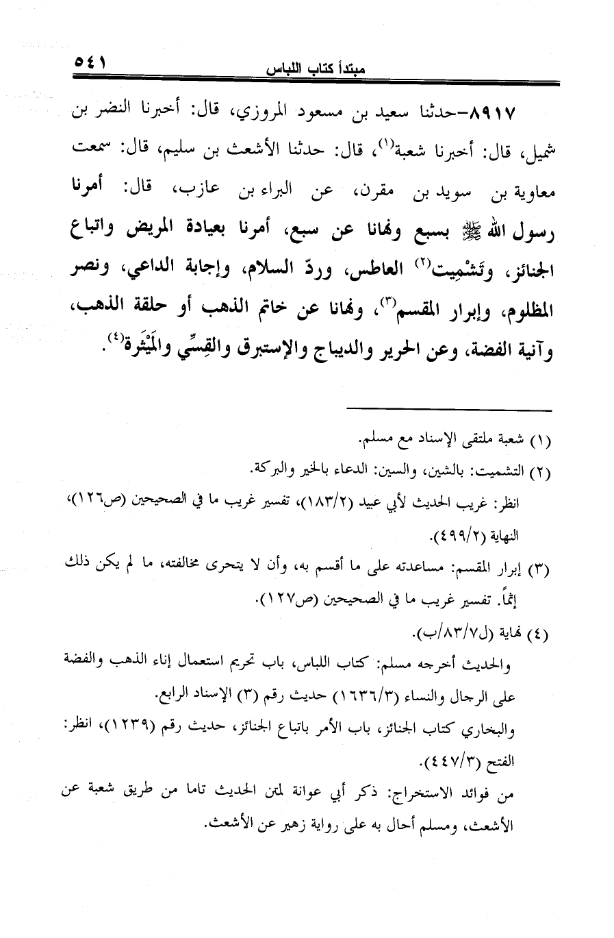 8917 - حدثنا سعيد بن مسعود المروزي، قال: أخبرنا النضر بن شميل، قال: أخبرنا شعبة (¬1)، قال: حدثنا الأشعث بن سليم، قال: سمعت معاوية بن سويد بن مقرن، عن البراء بن عازب، قال: أمرنا رسول الله -صلى الله عليه وسلم- بسبع ونهانا عن سبع، أمرنا بعيادة المريض واتباع الجنائز، وتَشْمِيت (¬2) العاطس، وردّ السلام، وإجابة الداعي، ونصر المظلوم، وإبرار المقسم (¬3)، ونهانا عن خاتم الذهب أو حلقة الذهب، وآنية الفضة، وعن الحرير والديباج والإستبرق والقِسِّي والمَيْثَرة (¬4).