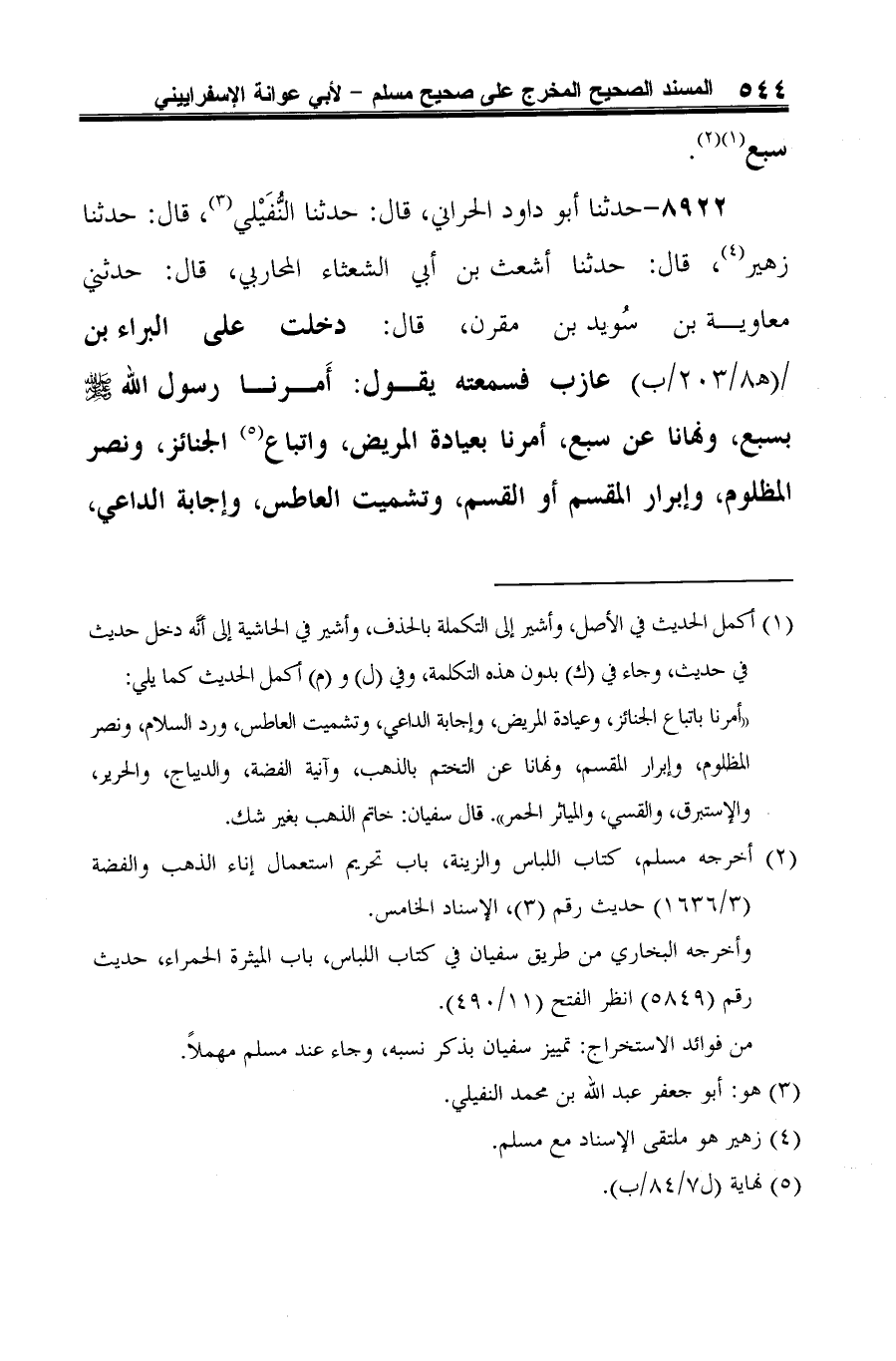 8922 - حدثنا أبو داود الحراني، قال: حدثنا النُّفَيْلي (¬1)، قال: حدثنا زهير (¬2)، قال: حدثنا أشعث بن أبي الشعثاء المحاربي، قال: حدثني معاوية بن سُويد بن مقرن، قال: دخلت على البراء بن عازب فسمعته يقول: أَمرنا رسول الله بسبع، ونهانا عن سبع، أمرنا بعيادة المريض، واتباع (¬3) الجنائز، ونصر المظلوم، وإبرار المقسم أو القسم، وتشميت العاطس، وإجابة الداعي،