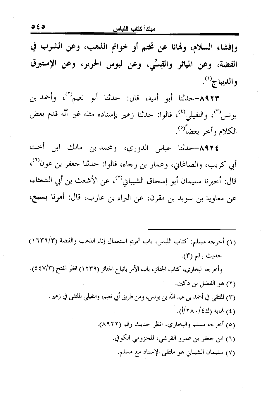 8924 - حدثنا عباس الدوري، ومحمد بن مالك ابن أخت أبي كريب، والصاغاني، وعمار بن رجاء، قالوا: حدثنا جعفر بن عون (¬1)، قال: أخبرنا سليمان أبو إسحاق الشيباني (¬2)، عن الأشعث بن أبي الشعثاء، عن معاوية بن سويد بن مقرن، عن البراء بن عازب، قال: أمرنا بسبع،
