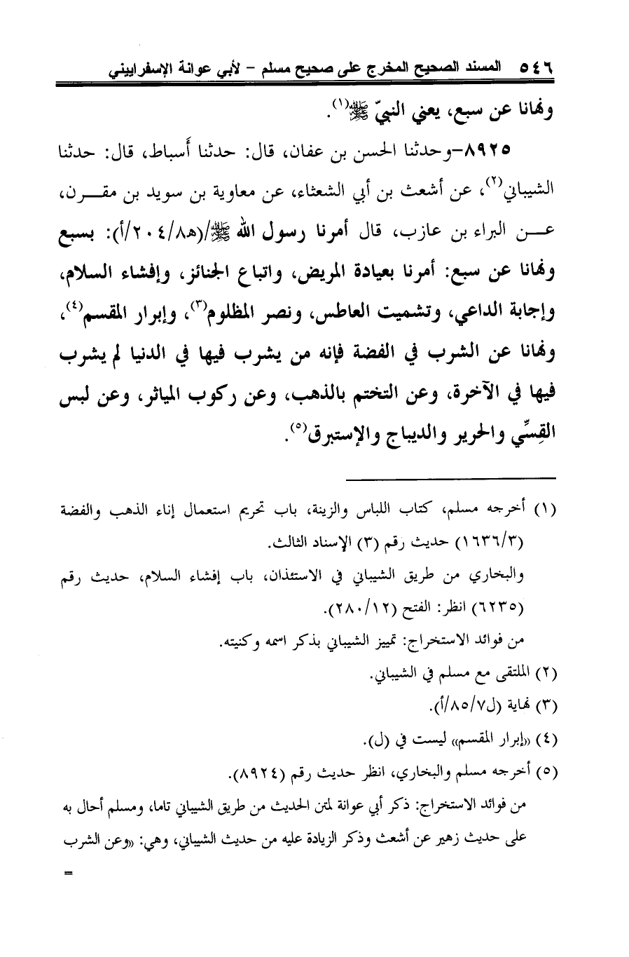 8925 - وحدثنا الحسن بن عفان، قال: حدثنا أَسباط، قال: حدثنا الشيباني (¬1)، عن أشعث بن أبي الشعثاء، عن معاوية بن سويد بن مقرن، عن البراء بن عازب، قال أمرنا رسول الله -صلى الله عليه وسلم-: بسبع ونهانا عن سبع: أمرنا بعيادة المريض، واتباع الجنائز، وإفشاء السلام، وإجابة الداعي، وتشميت العاطس، ونصر المظلوم (¬2)، وإبرار المقسم (¬3)، ونهانا عن الشرب في الفضة فإنه من يشرب فيها في الدنيا لم يشرب فيها في الآخرة، وعن التختم بالذهب، وعن ركوب المياثر، وعن لبس القِسِّي والحرير والديباج والإستبرق (¬4).