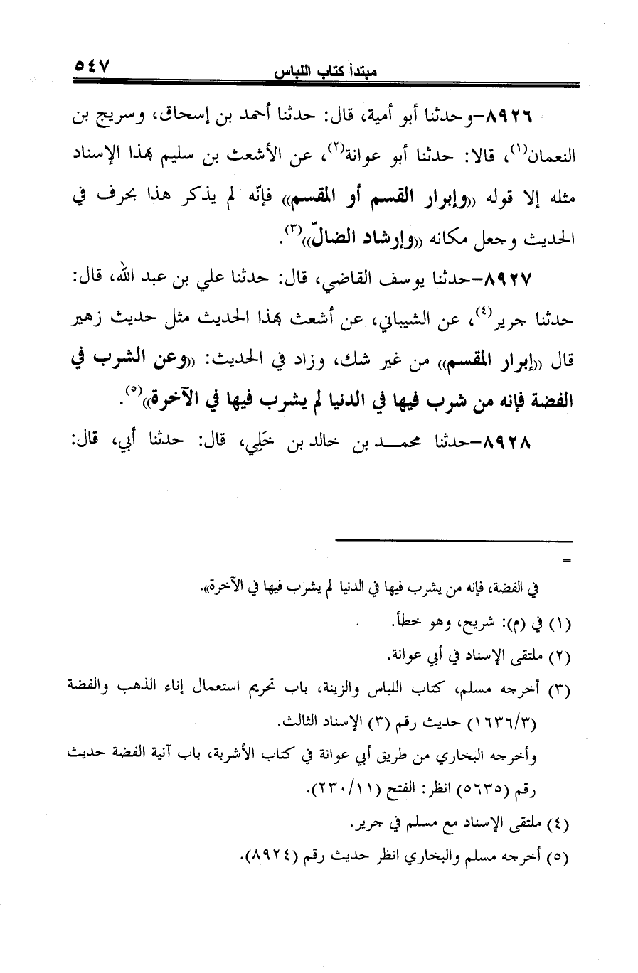 8927 - حدثنا يوسف القاضي، قال: حدثنا علي بن عبد الله، قال: حدثنا جرير (¬1)، عن الشيباني، عن أشعث بهذا الحديث مثل حديث زهير قال "إبرار المقسم" من غير شك، وزاد في الحديث: "وعن الشرب في الفضة فإنه من شرب فيها في الدنيا لم يشرب فيها في الآخرة" (¬2).