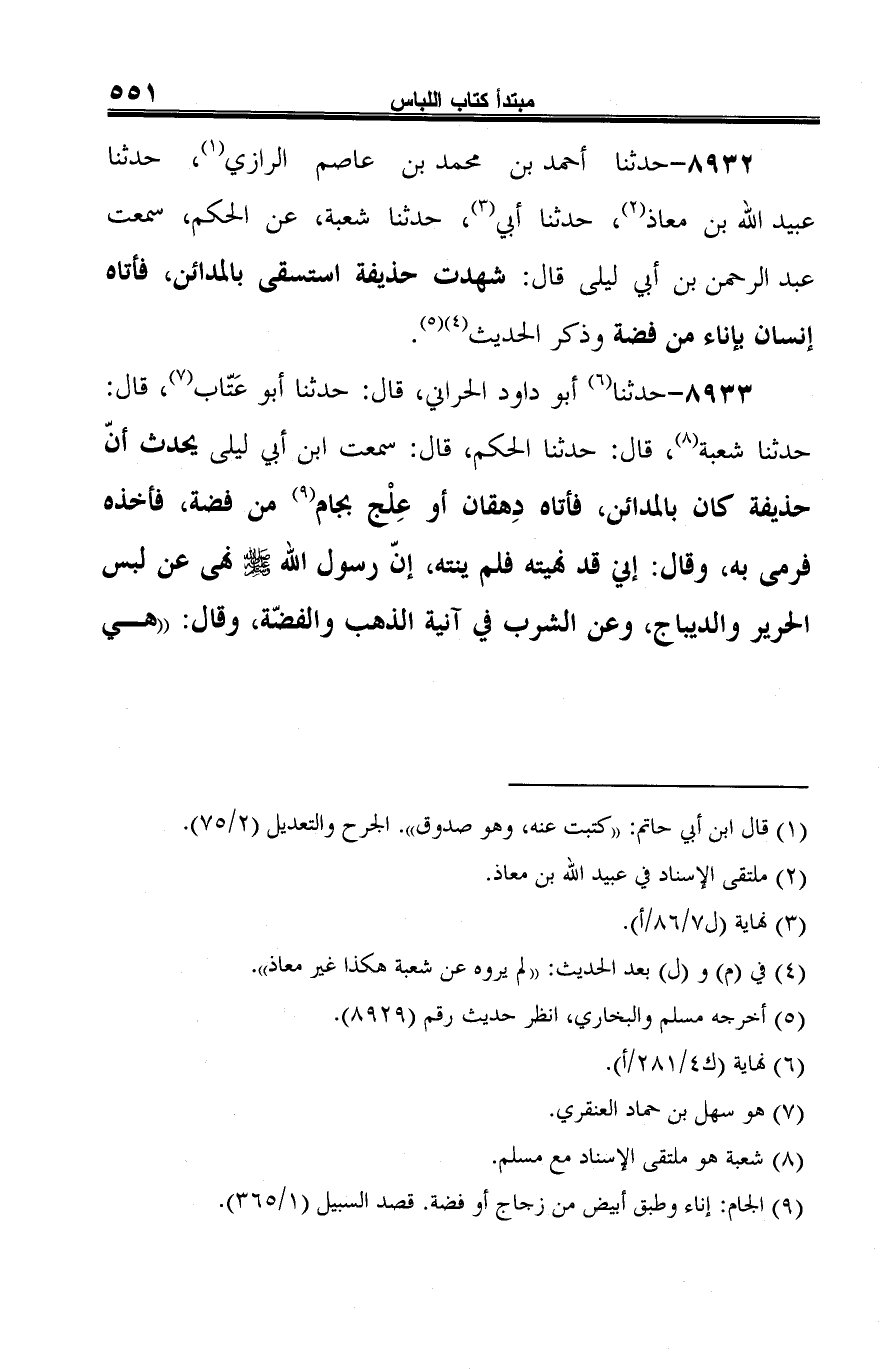 8932 - حدثنا أحمد بن محمد بن عاصم الرازي (¬1)، حدثنا عبيد الله بن معاذ (¬2)، حدثنا أبي (¬3)، حدثنا شعبة، عن الحكم، سمعت عبد الرحمن بن أبي ليلى قال: شهدت حذيفة استسقى بالمدائن، فأتاه إنسان بإناء من فضة وذكر الحديث (¬4) (¬5).