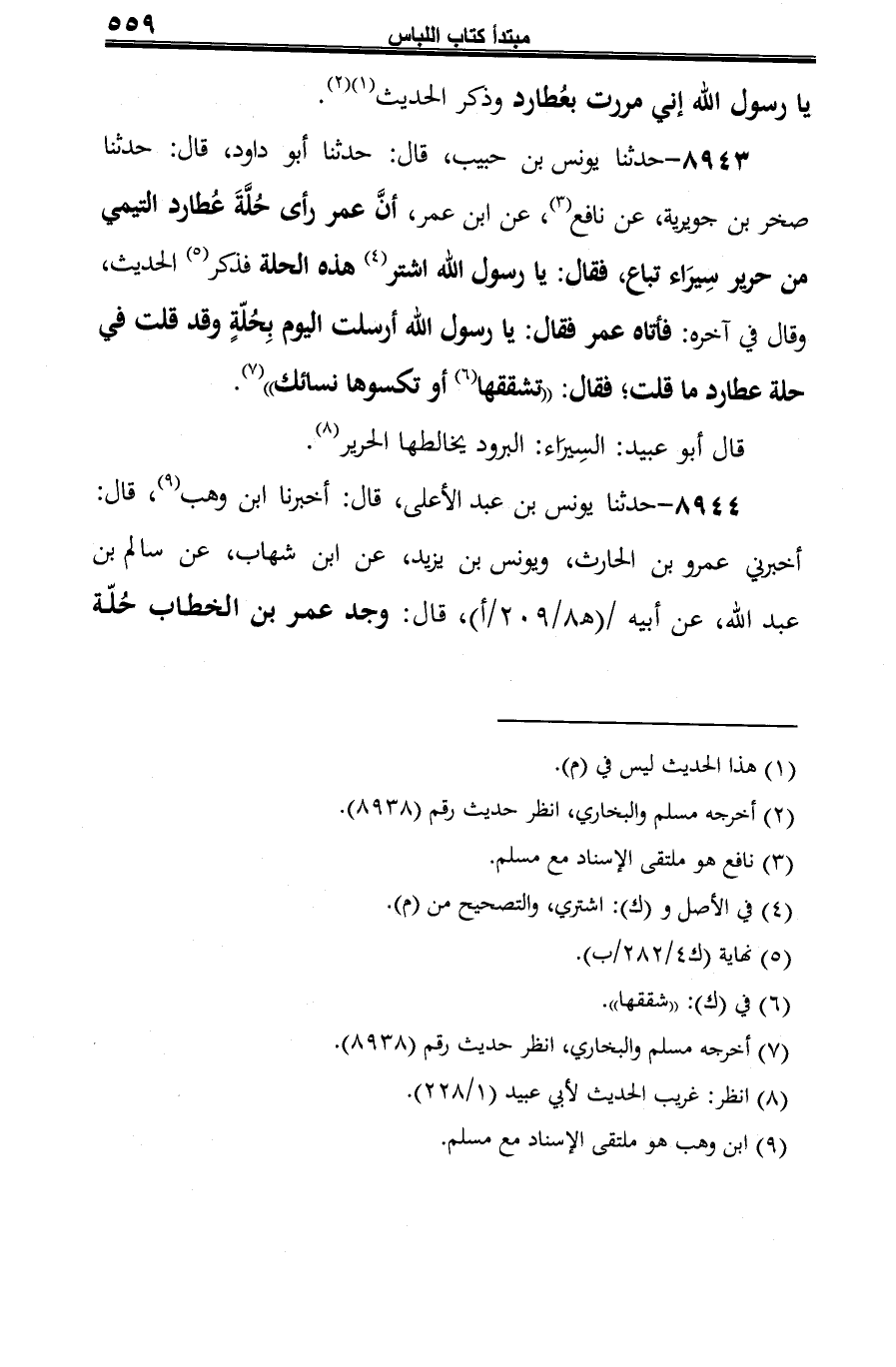 8943 - حدثنا يونس بن حبيب، قال: حدثنا أبو داود، قال: حدثنا صخر بن جويرية، عن نافع (¬1)، عن ابن عمر، أنَّ عمر رأى حُلَّةَ عُطارد التيمي من حرير سِيرَاء تباع، فقال: يا رسول الله اشتر (¬2) هذه الحلة فذكر (¬3) الحديث، وقال في آخره: فأتاه عمر فقال: يا رسول الله أرسلت اليوم بِحُلّةٍ وقد قلت في حلة عطارد ما قلت؛ فقال: "تشققها (¬4) أو تكسوها نسائك" (¬5).