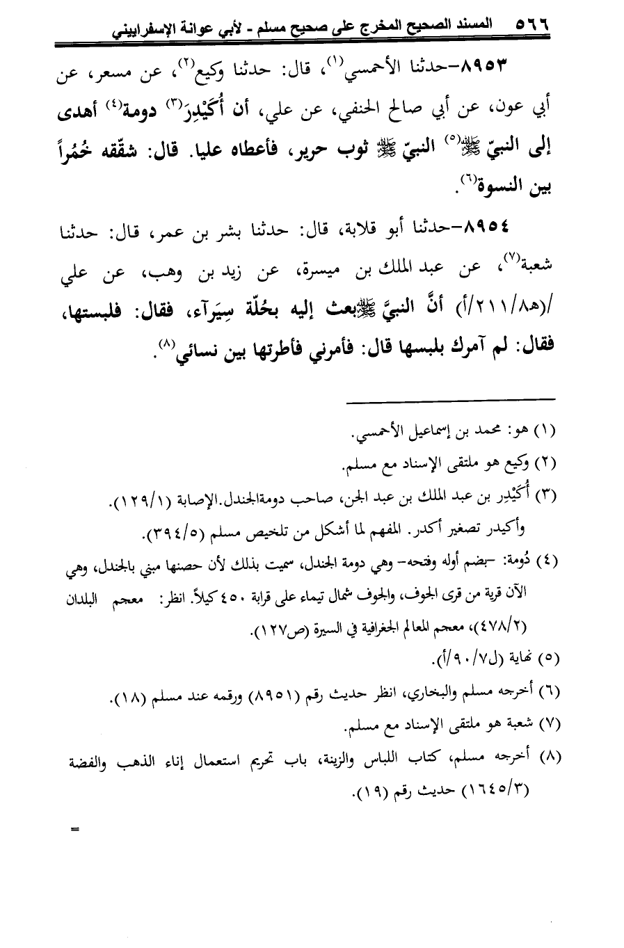8953 - حدثنا الأحمسي (¬1)، قال: حدثنا وكيع (¬2)، عن مسعر، عن أبي عون، عن أبي صالح الحنفي، عن علي، أن أُكَيْدِرَ (¬3) دومة (¬4) أهدى إلى النبيّ -صلى الله عليه وسلم- (¬5) ثوب حرير، فأعطاه عليًّا. قال: شقّقه خُمُرًا بين النسوة (¬6).