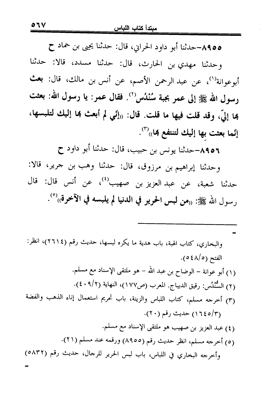 وحدثنا مهدي بن الحارث، قال: حدثنا مسدد، قالا: حدثنا أبو عوانة (¬1)، عن عبد الرحمن الأصم، عن أنس بن مالك، قال: بعث رسول الله -صَلَّى الله عَلَيْهِ وَسَلَّمَ- إلى عمر بجبة سُنْدُس (¬2). فقال عمر: يا رسول الله: بعثت بها إليّ، وقد قلت فيها ما قلت. قال: "إنِّي لم أبعث بها إليك لتلبسها، إنّما بعثت بِها إليك لتنتفع بها" (¬3).